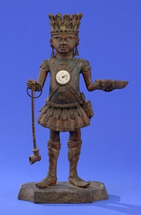 Vollrund geschnitzte Figur eines südamerikanischen Indianers, polychrom gefasst. Taschenuhrwerk mit Spindelgang. Signiert. H 48 cm.