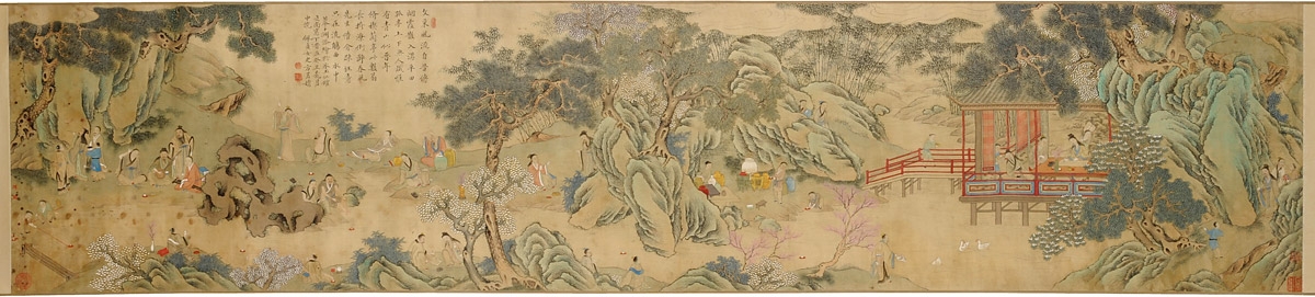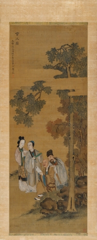 978Bildrolle China 19. Jhdt. Landschaft mit Höflingen und Gelehrten. Siegelmarke. Bezeichnet. Tusche, Aquarell und Farben auf Seide. Unter Glas gerahmt. 152 x 62 cm 500 EUR |