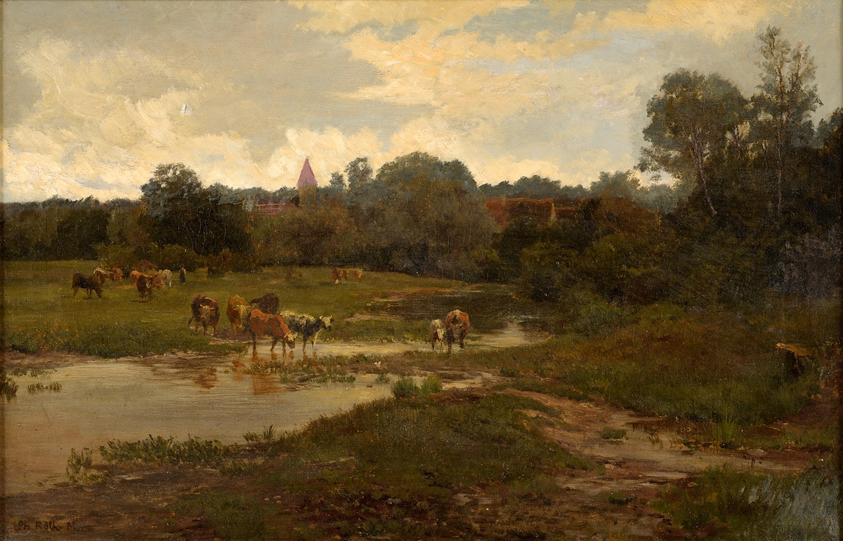 Röth, Philipp 1841 Darmstadt - 1921 München Flusslandschaft mit Weidevieh. Signiert. Öl/Lwd., 35 x 54 cm