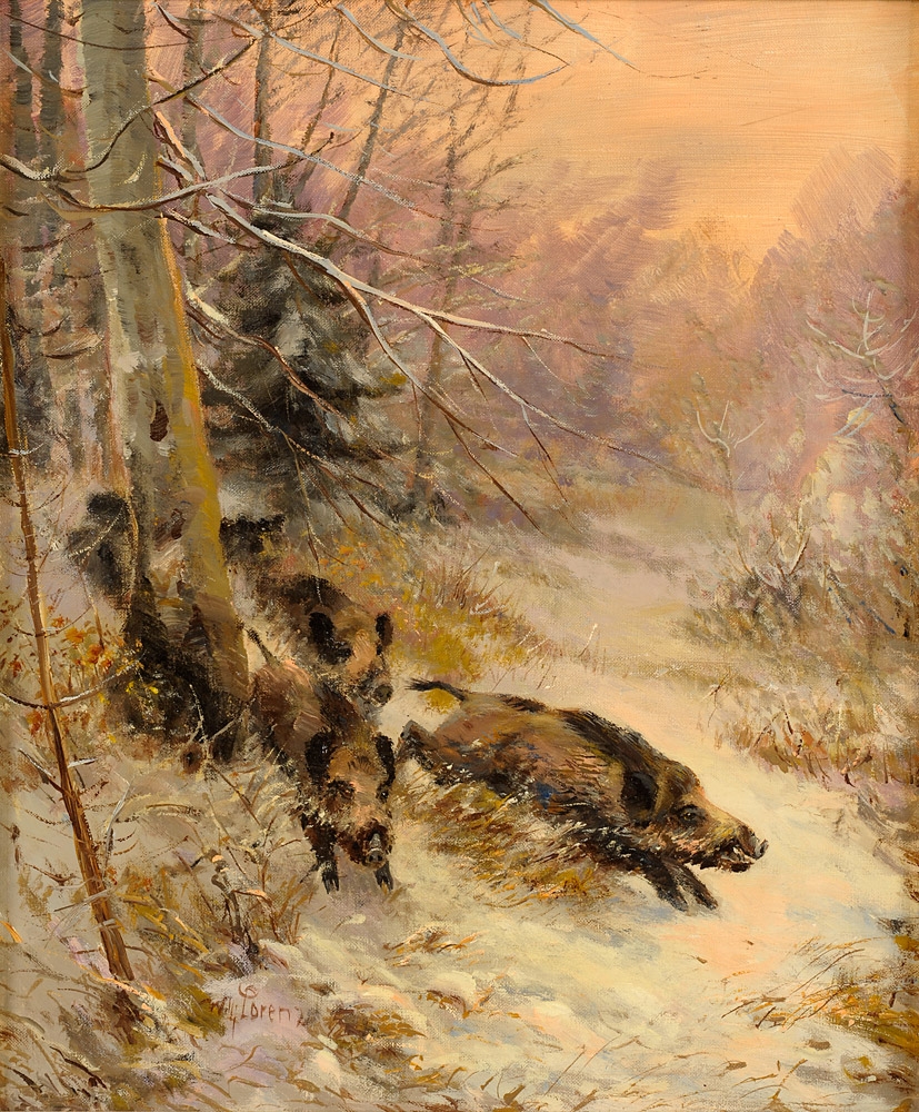 Lorenz, Willi 1901 Köln - 1981 ebenda Schwarzwild im Winterwald. Signiert. Öl/Lwd., 60 x 50 cm