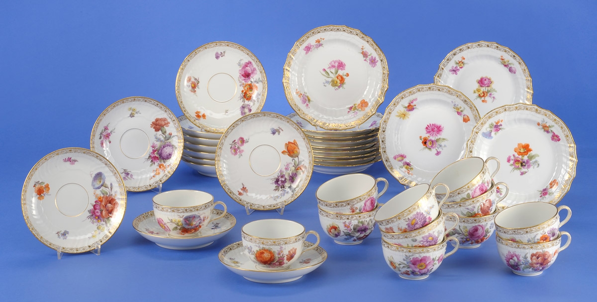 2001Zwölf KPM-Tassen mit Untertassen und 12 Kuchenteller Um 1900 Buntes Blumendekor. Ziervergoldet. Zeptermarke. Reichsapfel in rot und KPM. Auktion: Freitag, 06.12.2013 ab 14:00150 EUR |