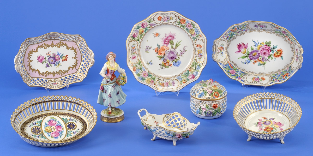 2027Dresden-Konvolut Acht Teile Schalen, Platte, Bonboniere und Figur. Manufakturmarken. Ø 26 cm. Auktion: Freitag, 06.12.2013 ab 14:00 100 EUR |