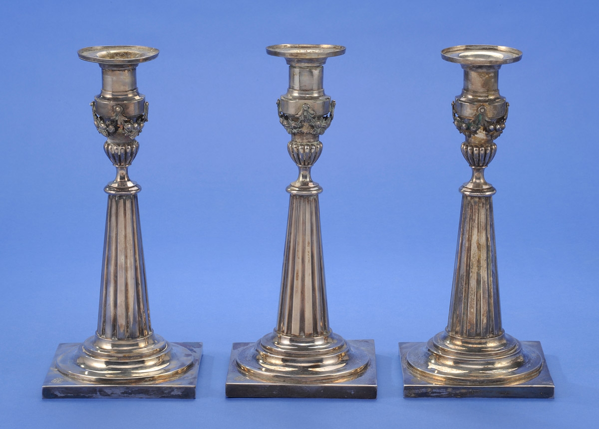 905Satz von drei Kerzenhaltern Augsburg 1787 - 1791 Einflammig. Kannelierter Säulenschaft. Punzen. Verschiedene Meistermarken. H 25,5 cm. Zus. 1218 g. Auktion: Donnerstag, 05.12.2013 ab 12:00 500 EUR |