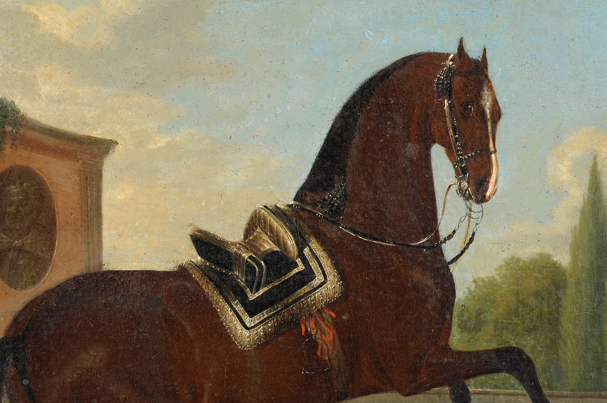 21Hamilton, Johann Georg von 1672 Brüssel - 1737 Wien (zugeschr.) Hengst bei der Croupade im Schlosspark. Öl/Lwd./doubl., 54 x 64 cm 400 EUR |