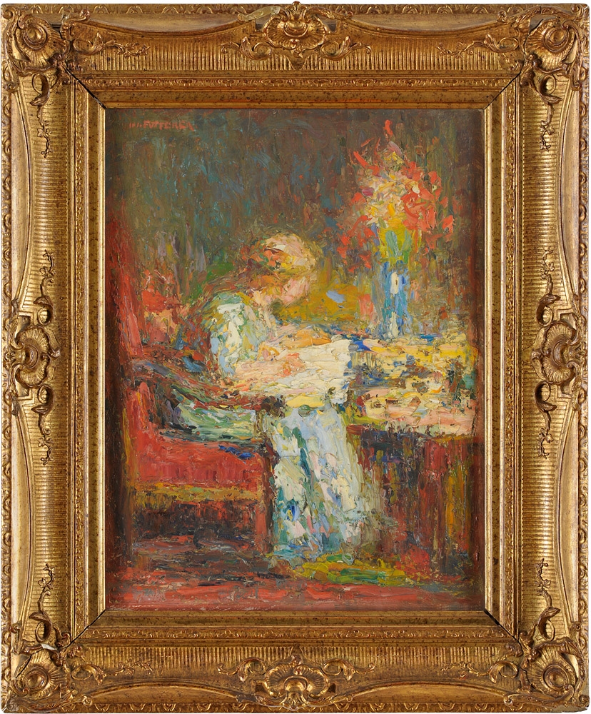 17Futterer, Josef 1871 Mondfeld - 1930 München Mutter mit Kind an einem Tisch sitzend. Signiert. Öl/Lwd., 56 x 43 cm 300 EUR |