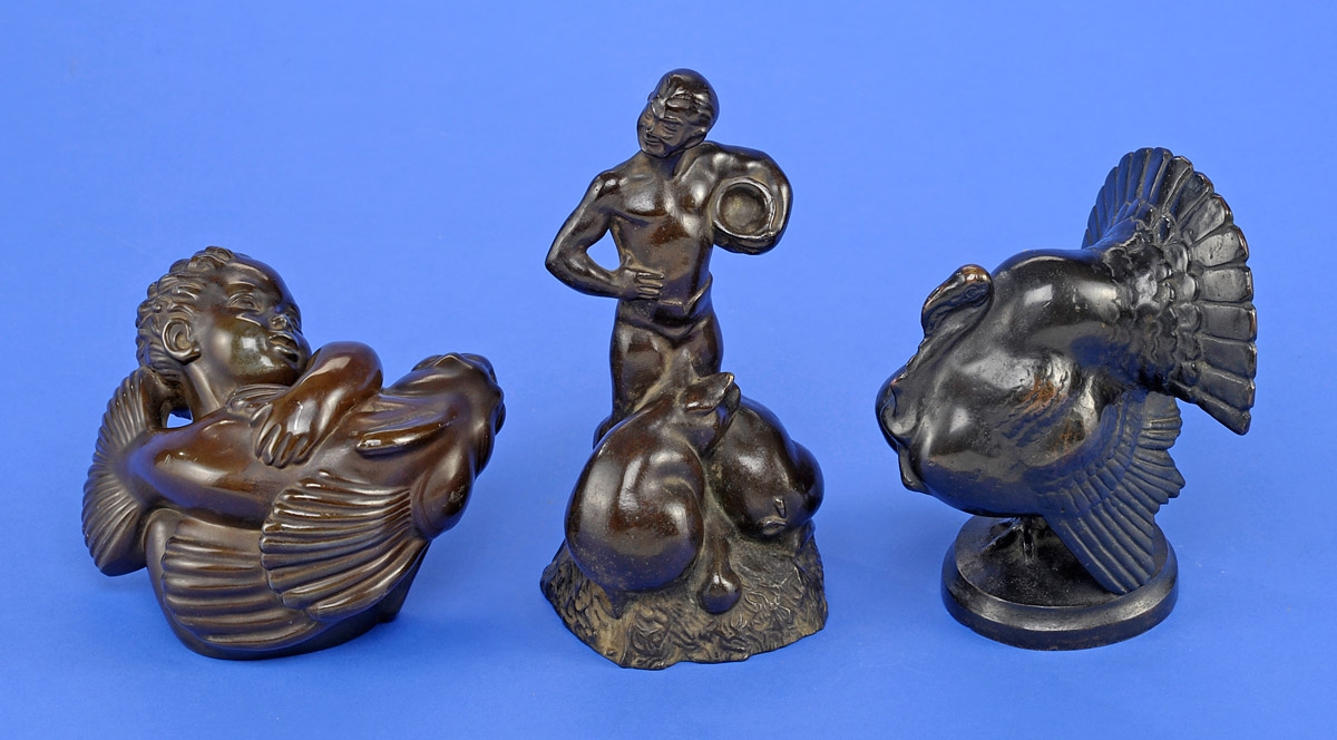 1588Drei Kleinskulpturen Erstes Drittel 20. Jhdt. Bronze. Knabe mit Fisch, Zinn. H 19 cm und kleiner. 150 EUR |