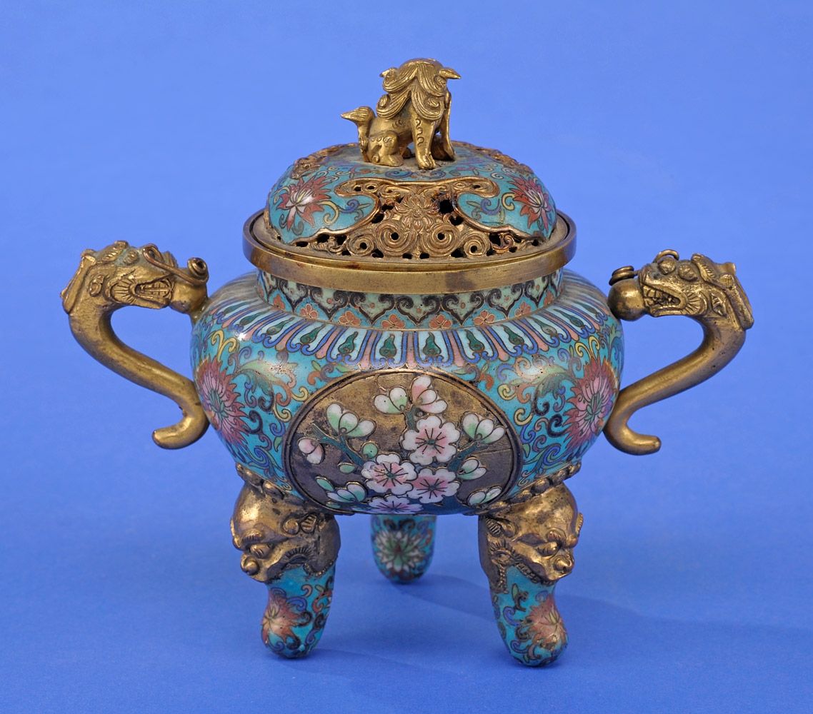 1617Koro China 19. Jhdt. Umlaufendes Emailledekor und vergoldet. Guter Zustand. Durchbrochen gearbeiteter Deckel. H 14 cm 200 EUR |