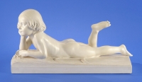 1604Mayer, Franz Josef 1887 Berchtesgaden Liegender Frauenakt. Bronze. Signiert. Marmorplinthe. H 27 cm, L 48 cm 200 EUR |