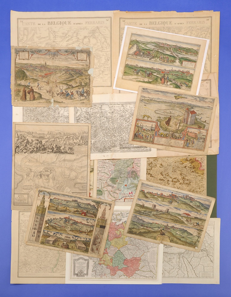 364Sammlung von 13 Landkarten 17.-18. Jhdt. Überwiegend Kupferstiche handkoloriert. Köln, Dresden, Mecklenburg u.a. 52 x 60 cm und kleiner. 200 EUR |