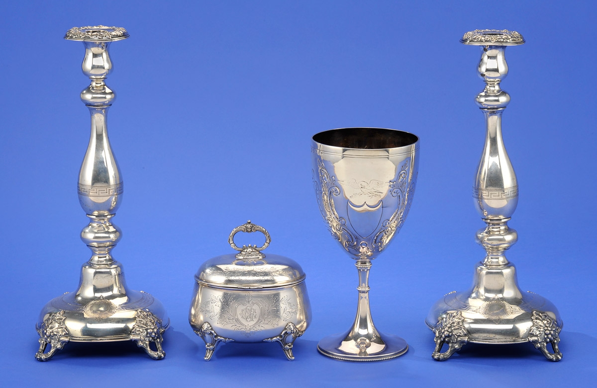 819Ein Paar Kerzenhalter, Pokal und Zuckerdose 19. Jhdt. Marken. Verschiedene Feingehalte. Kerzenhalter: H 36 cm. Zus. 1450 g. 200 EUR |