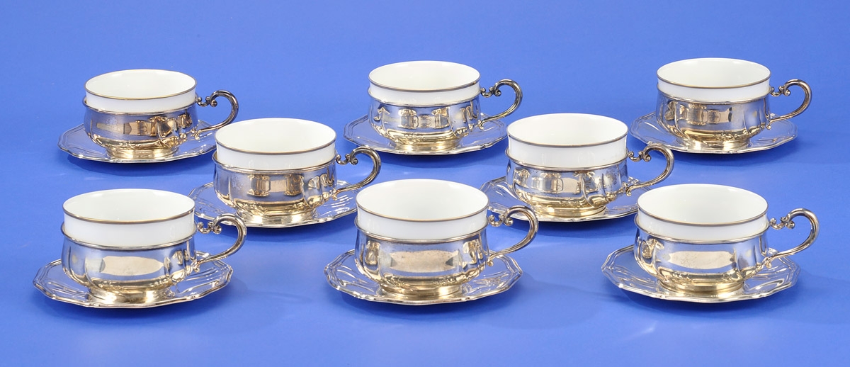 813Acht Tassen mit Porzellaneinsätzen und Untertassen Marken. 835-Feingehalt. 932 g (ohne Einsätze gewogen). 150 EUR |