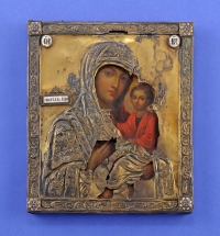 830Ikone von Sergej Ignatevitch Sazikoff (1830 - 1871) Moskau 1840 Muttergottes mit Kind. Vergoldetes Silberoklad, zum Teil emailliert. Beschädigt. Punzen. 84-Zolotnik. 31 x 27 cm 200 EUR |