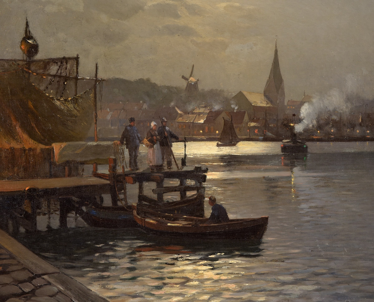 Ostdeutsche Hafenstadt bei Mondschein.